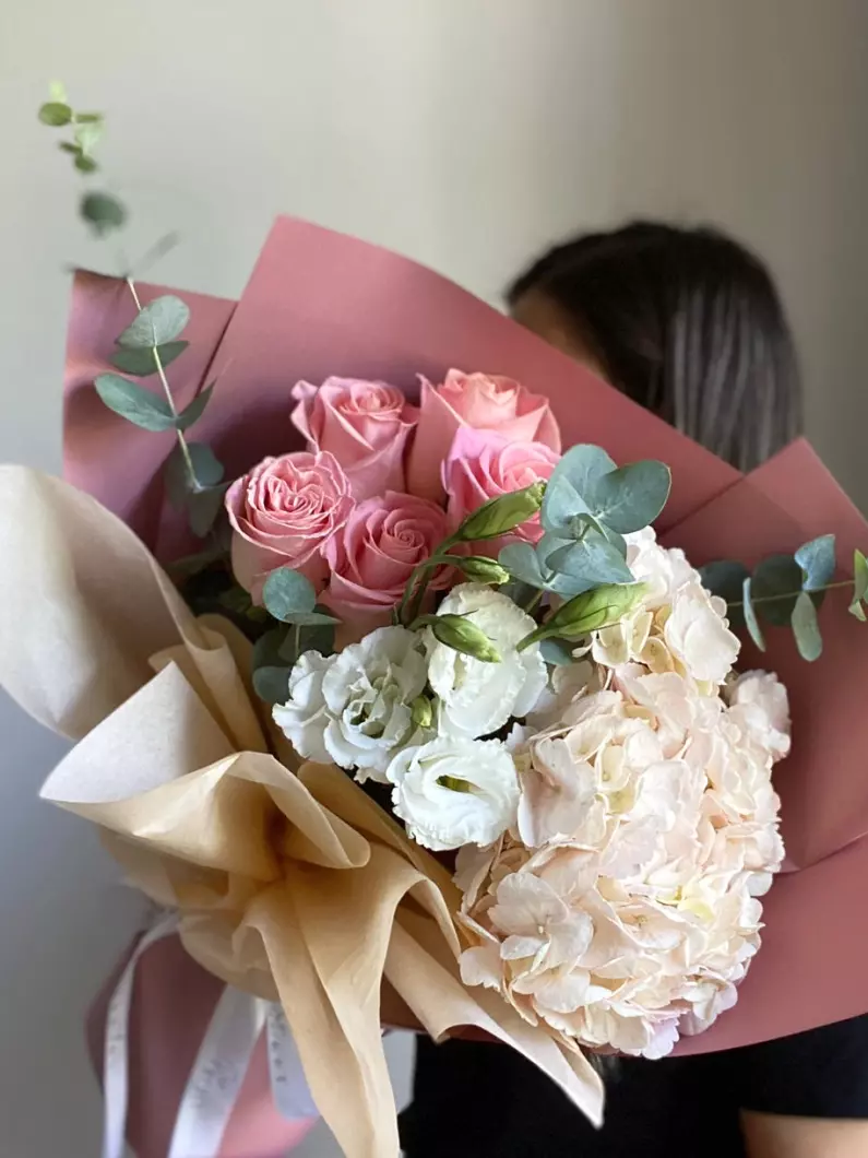 Букет «Единственная моя» выглядит элегантно и мило. Нежная розовая гортензия в окружении лизиантуса, роз и эвкалипта создает стильную цветочную композицию. Такой презент станет отличным сюрпризом для улучшения настроения. Украсит торжественное мероприятие, поможет выразить искренность и уважение.