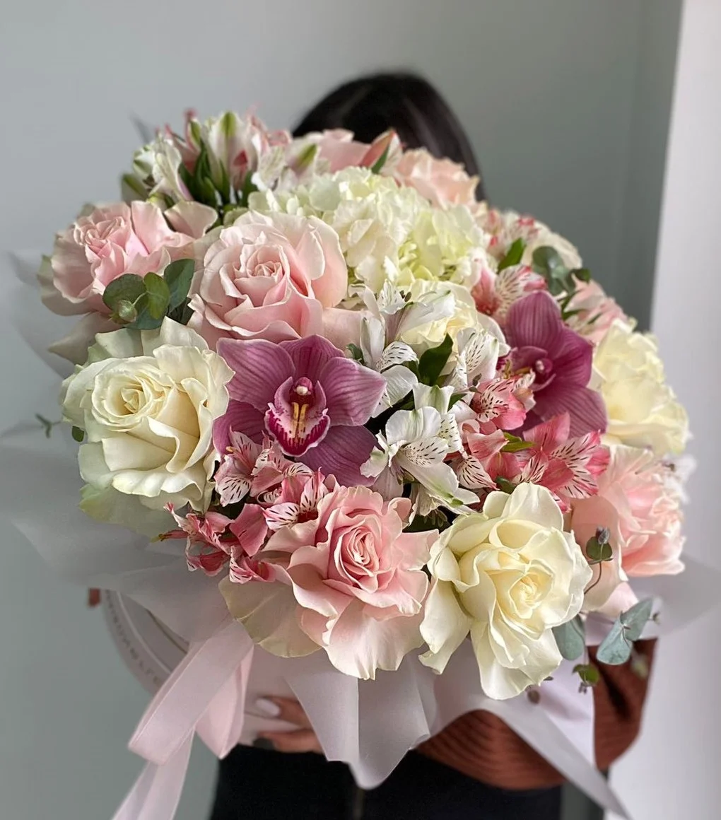 Композиция «Je taime» словно сошла со страниц французского романа о любви. Нежность, элегантность и искренность сочетаются в этом букете. Комбинация изысканных роз, ажурных гортензий, альстромерий и эвкалипта лучше слов расскажет об истинном отношении. Используется шляпная коробка, которая дополняет общее впечатление.