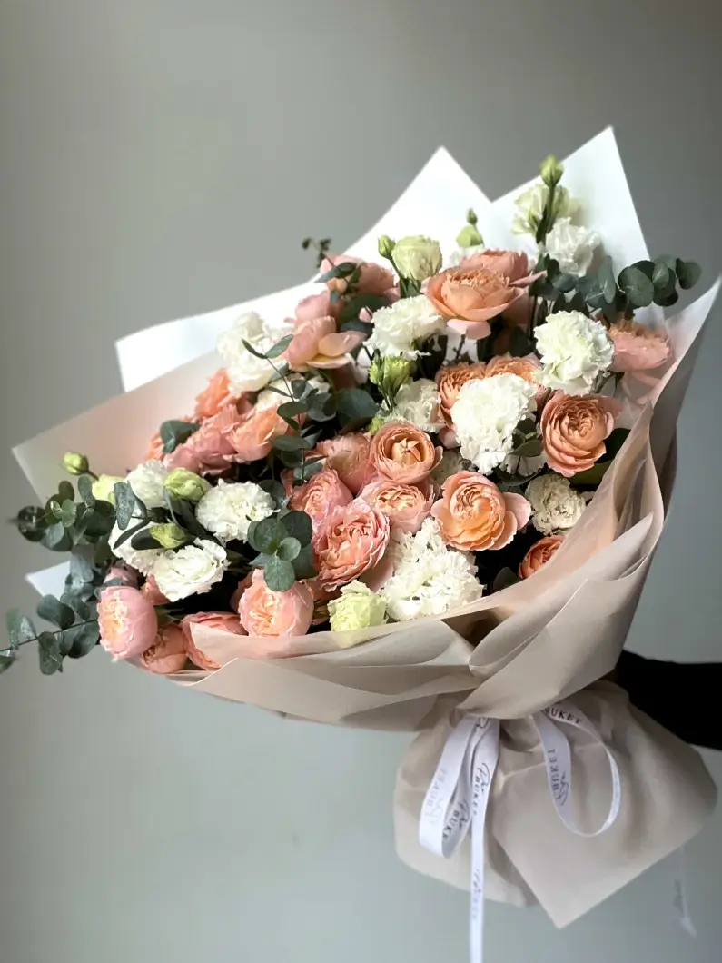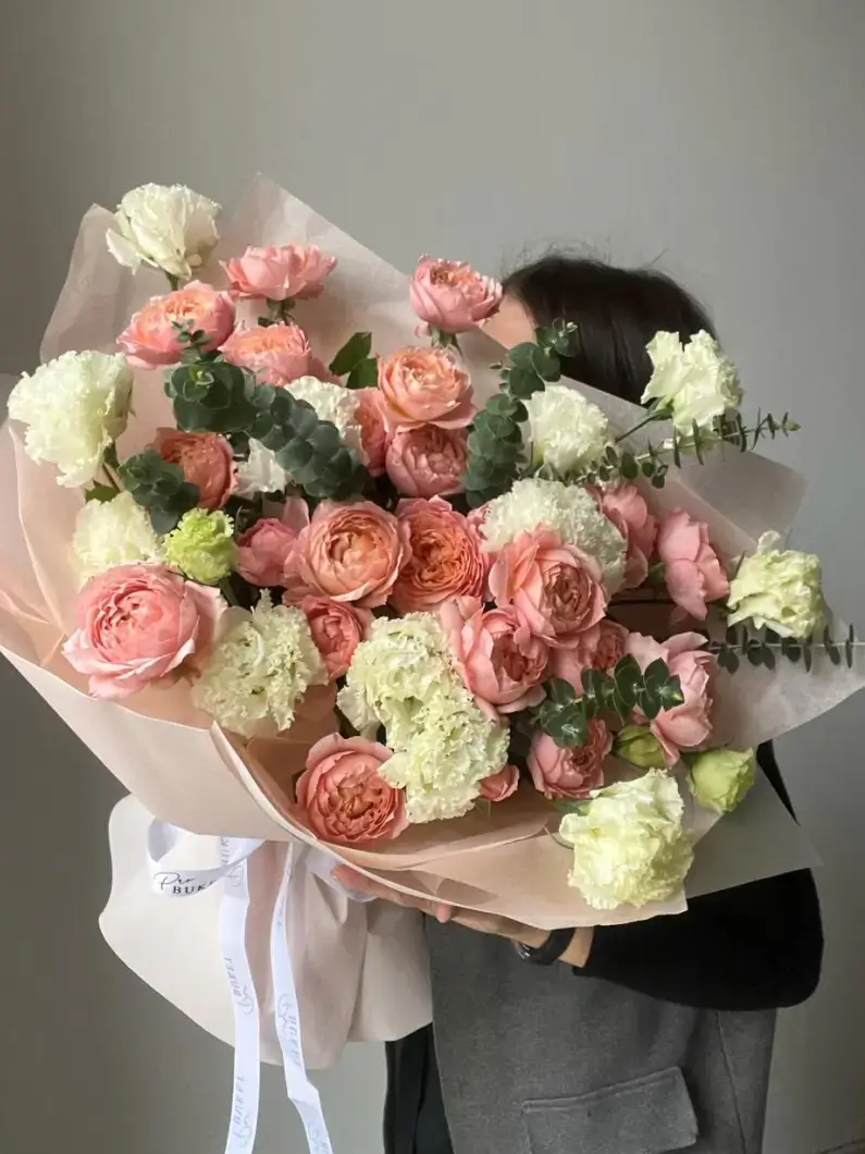 Состав: розы Джульетта – 5 шт., лизиантусы – 3 шт., эвкалипт.