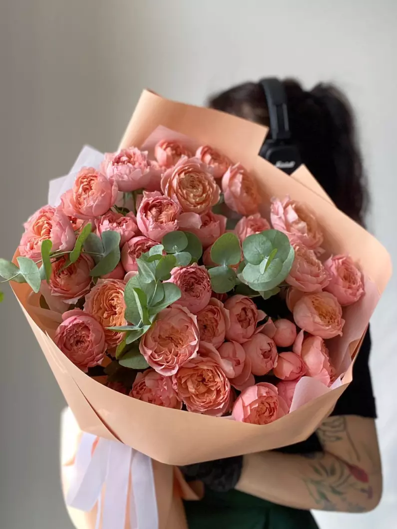 Состав: пионовидные розы (сорт Juliet) — 7 шт, эвкалипт.