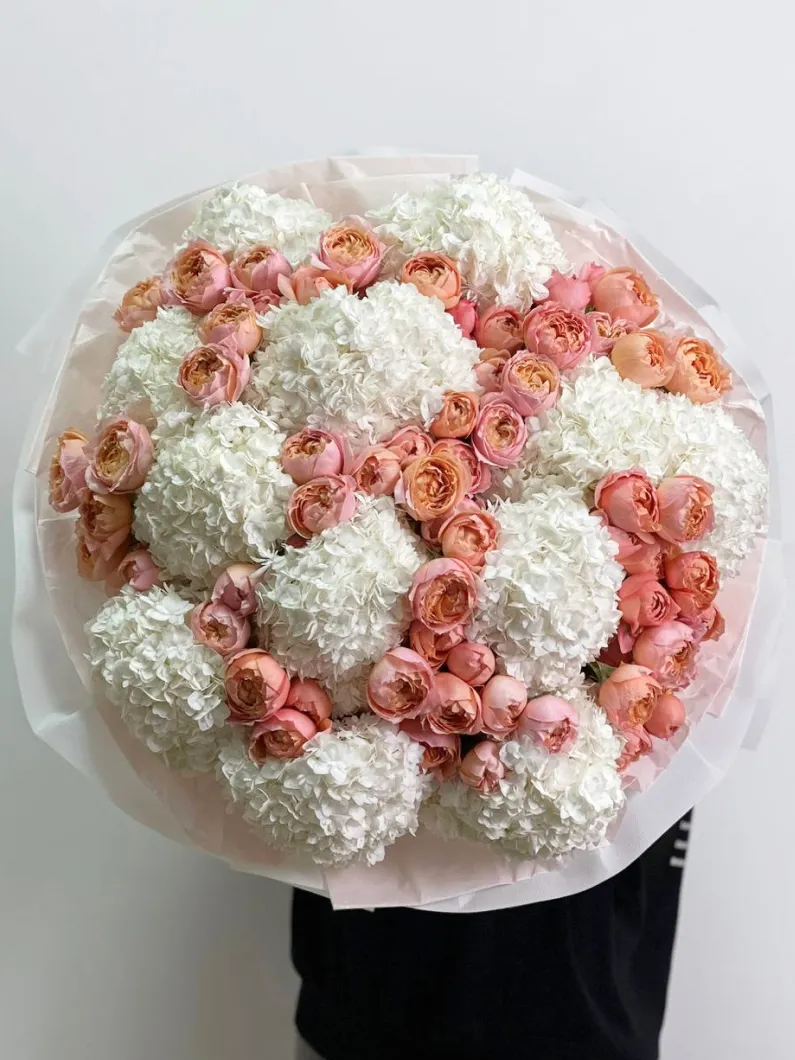 Состав: розы — 9 шт, гортензии — 1 шт, гвоздики — 3 шт, лизиантусы — 2 шт, орхидеи — 1 шт, гипсофила, эвкалипт.